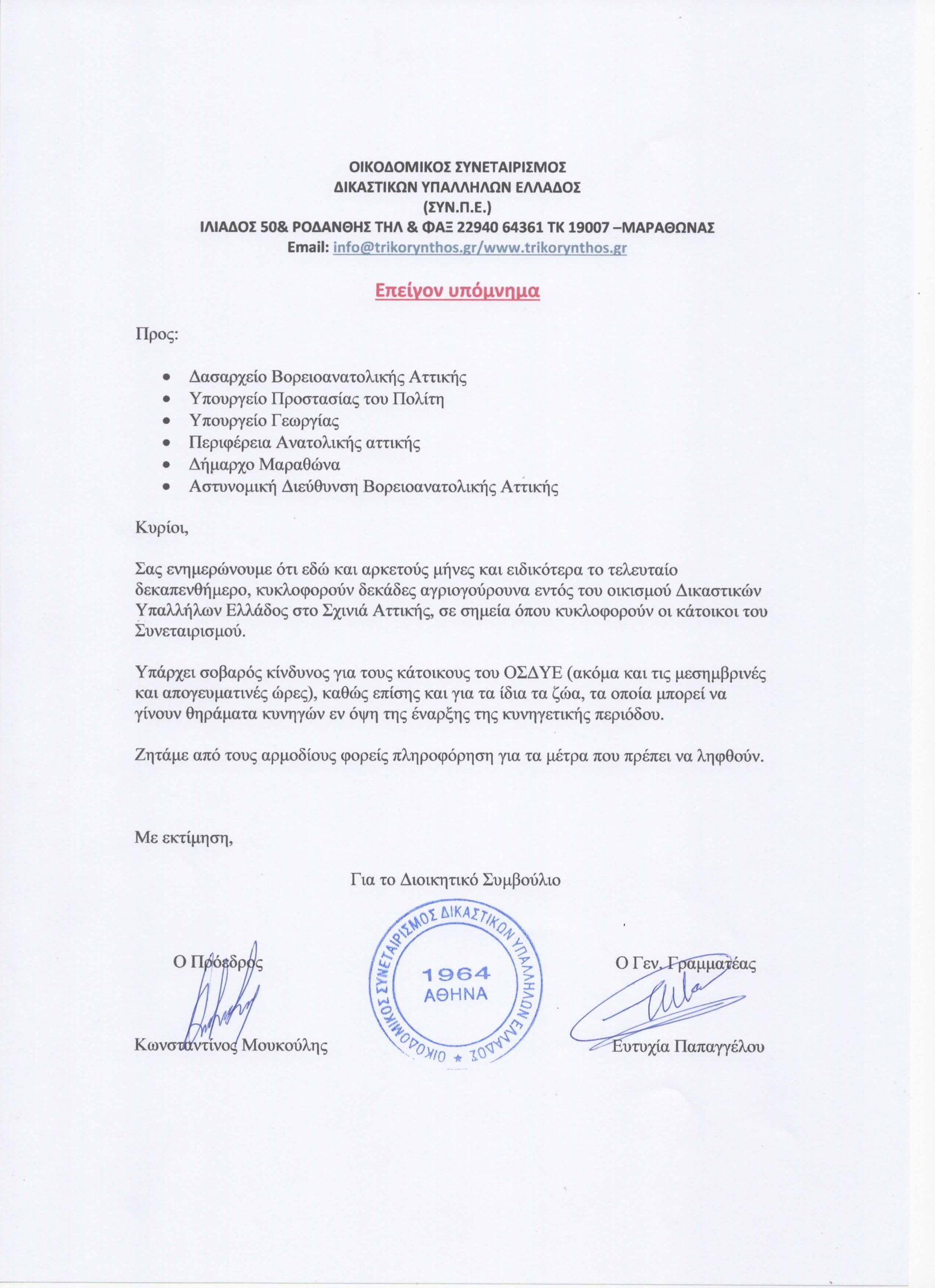 ΚΟΙΝΟΠΟΙΗΣΗ ΥΠΟΜΝΗΜΑΤΟΣ ΣΧΕΤΙΚΑ ΜΕ ΤΑ ΑΓΡΙΟΓΟΥΡΟΥΝΑ